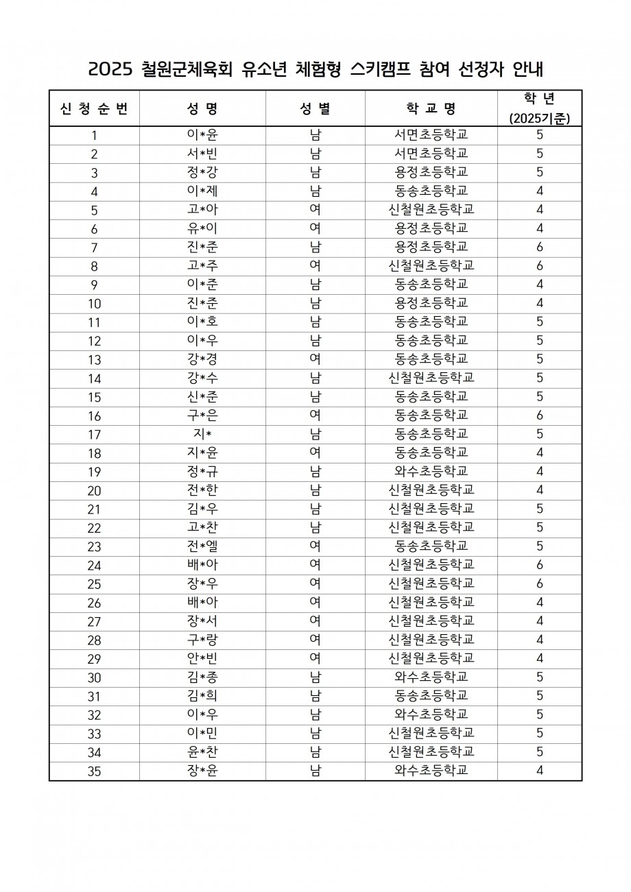 2025 철원군체육회 유소년 체험형 스키캠프 선정자 안내 작성자 : 철원군체육회 작성일 : 25-11-28 14:38 조회 : 50회 다음글 목록 2025년도 스키캠프 참가자가 위와 같이 선정되었음을 안내드립니다. 등록된 댓글이 없습니다. 다음글 목록