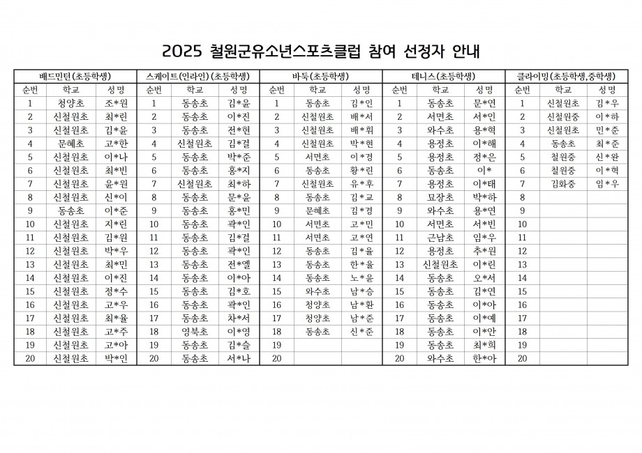 2025 철원군유소년스포츠클럽 사업 선정자 안내 작성자 : 철원군체육회 작성일 : 25-04-03 14:59 조회 : 1,167회 이전글 다음글 목록 등록된 댓글이 없습니다. 이전글 다음글 목록